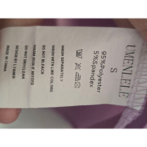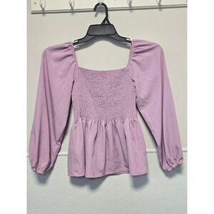 Pre-owned UMENELE brand women's blouse, size small. Purple/pink made of 95% polyester and 5% spandex. Features long, slightly puffed sleeves, smocked bodice, and a fitted peplum waist. The blouse shows no visible stains or tears. The condition is good, showing minimal signs of wear. Care instructions include washing separately, no bleach, warm iron if needed, and do not dry clean.