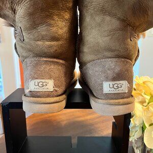 The product is a pair of women's UGG Bailey Button Boots in brown, size 7. These stylish boots feature a shearling style, suede upper material, and a comfortable design perfect for everyday wear. The UGG brand is known for its quality and trendy footwear, making these boots a popular choice for women looking for both style and comfort in their footwear. Perfect for adding a touch of luxury to any outfit, these boots are a versatile and fashionable addition to any shoe collection.
