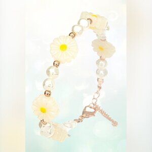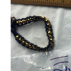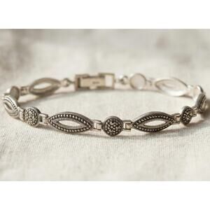 This a silver-tone bracelet featuring a chain link design with alternating black and iridescent heart-shaped charms. The bracelet is approximately 10 inches in length and has a lobster claw clasp. The charms are made of a smooth, polished material that appears to be metal or plastic. The bracelet is in excellent condition and shows no signs of wear or damage. It comes without tags or box.