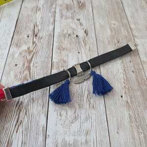 This pre-owned bracelet features a woven band with a colorful geometric pattern.. A decorative blue button with a rhinestone border is centered on the band. Two blue tassels and a silver-colored feather charm dangle from the button. The bracelet has a silver-tone metal clasp for closure. There are no visible signs of damage.