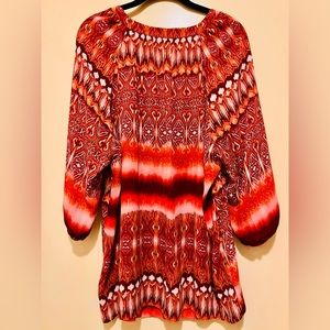 Hi! Beautiful Top can layer w Tanks and goes w so many things. Estimated Size Large to XLarge Long Sleeve. No Tags/Sizing/No Branding. Reds, Oranges, Whites, Copper, Pink, Maroon Ombré Style. Open V-Neck No Buttons. No Elastic at end of Wrists.