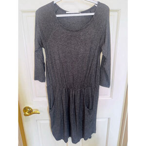 This pre-owned women's unbranded mini dress is crafted from a dark grey heathered knit fabric. It features a scoop neckline and raglan 3/4 length sleeves. An elasticized waist creates a blouson-style top and a gathered skirt with two functional front pockets. The dress appears to be in good overall condition, showing no significant visible imperfections or signs of wear beyond typical pre-owned status.