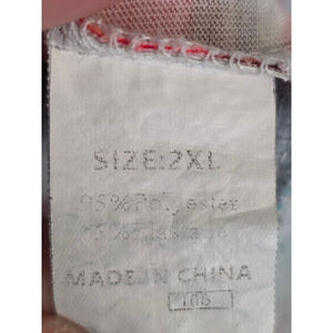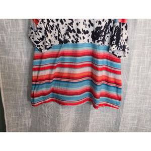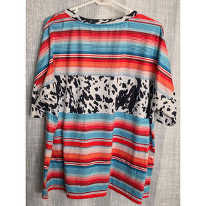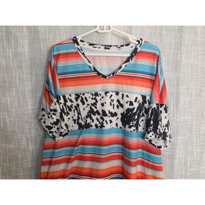This is a pre-owned, size 2XL/2XIS top. It features a V-neck and short sleeves. The top is made of 95% polyester and 5% spandex. The design incorporates a colorful striped pattern with red, orange, and blue hues, complemented by a black and white cow print panel. There are no visible stains some pilling on the fabric. The garment is machine-made in China.