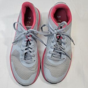 EUC women's Under Armour Micro G Cross Trainer in overcast gray and hot pink. Lightweight, breathable, and very comfortable. Size 8.