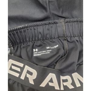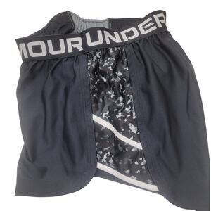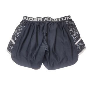 Authentic Women's Under Armour Play Up running/training shorts in size XS. Black with gray abstract/camo-style printed side panels, branded elastic waistband. Lightweight HeatGear fabric wicks sweat and dries quickly – perfect for runs, gym workouts, or casual wear. Loose fit with curved hem for comfort and flattering shape.