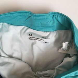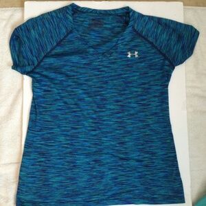 Women’s Under Armour SS T-Shirt AND Running Shorts, size Small. Shorts waist circumference 28 inches, length 10 1/2 inches. Under Armour SS t-shirt, V neck, 100% polyester, pit to pit 20 inches, shoulder to hem 23 1/2 inches. This shirt has no size tag, so please check the sizing measurements.