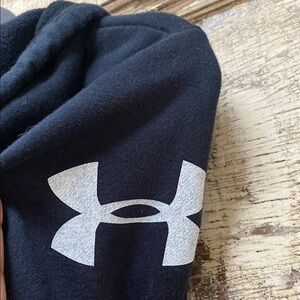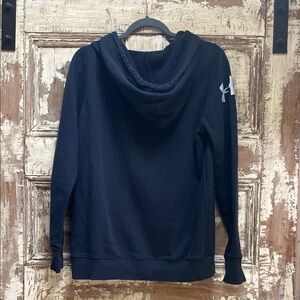 Navy hoodie featuring bold white Under Armour logo. Includes front pocket and drawstrings.