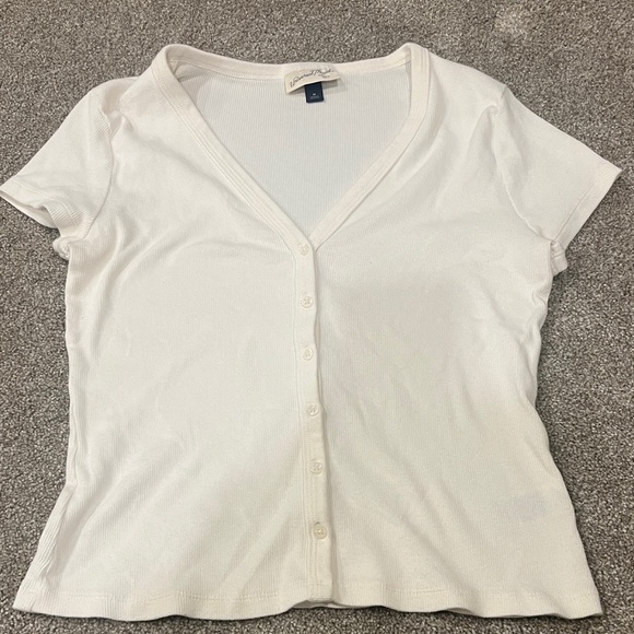 Cute cream button-down shirt. Short sleeves with a V-neckline. Soft and stretchy. Perfect for casual wear. Great condition. Worn twice. I needed a small.