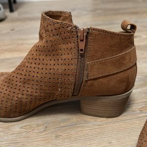 Previously loved, gently worn universal thread booties. Women’s size 9.5. Lower cut on the outer side with a decorative buckle. Zippers on inner side.