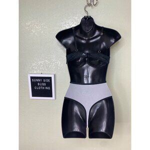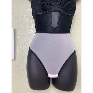 This is a black and white lace underwire bodysuit that clips with 3 buttons. It’s a size extra small in great preowned condition. No stains or flaws.