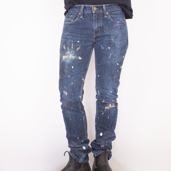 These classic Levi's 511 skinny jeans have been completely reimagined with bleach, dye, and paint for a raw, artistic edge. Each mark and color is intentional, creating a one-of-a-kind, wearable piece of art. Perfect for anyone who loves bold, unique style.