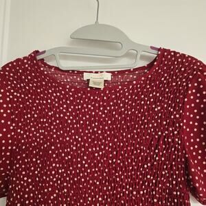Excellent condition, women's Urban Romantics red and white polka dot, smocked blouse. The top part is smocked and does stretch, the bottom is flowy and that material doesn't stretch.