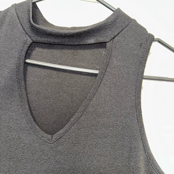 This is a pre-owned Urban Rose black dress. The dress features a sleeveless design with a high neckline and a V-shaped cutout at the chest. The dress has a fitted bodice and a flared skirt. The material appears to be a synthetic blend. The dress measures approximately 34 inches in length and 15 inches across the waist. There are some minor imperfections, including a small stain on the front of the skirt.