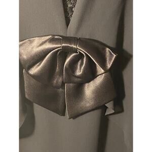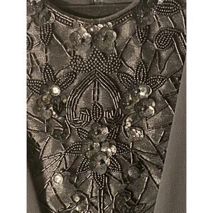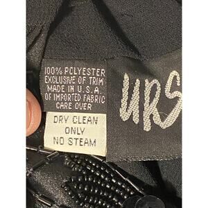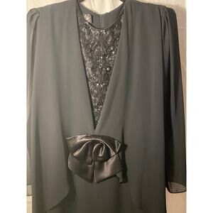 Women's Vintage, Ursula of Switzerland brand, Formal Dress. No Size Tag (Measurements below) but most likely a 14 or 16. Excellent Pre-loved condition. All black, chiffon - like fabric, fully lined, with black sequins and beads on front bodice panel, Front, black satin bow. Midi length on most. one piece full dress with sheer overlay that is very forgiving and flattering. Modest. Long sleeves.
