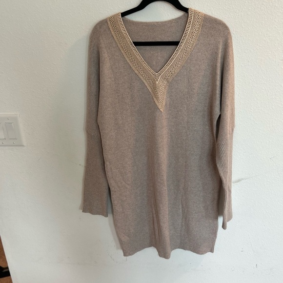 This dress has long sleeves and a V neck line , it has lace around the V neck. It is a light purple color