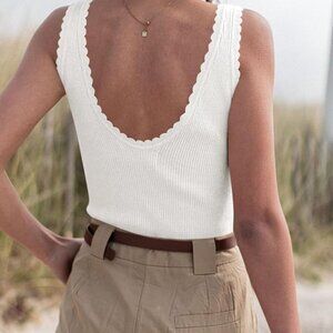 Features: This sleeveless V-neck tank top has a beautiful ribbed design with a scallop edge for a touch of elegance. It’s perfect for pairing with shorts, jeans, or skirts to showcase your personal style during warm days.