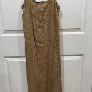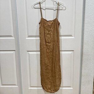 This is a women's slip dress from the brand OSKLEN in a size small. The dress is made from recycled linen material in a tan color, featuring a midi length. This stylish and sustainable piece is perfect for a casual yet chic look.
