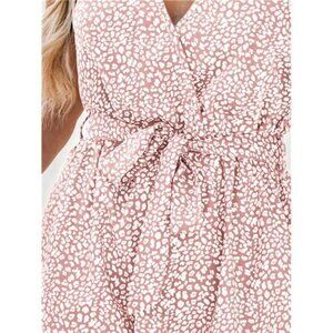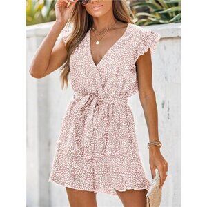 Unique Design: Introducing our charming pink floral flutter romper, crafted from woven fabric with a delightful floral print. This romper features a v-neck, cap flutter sleeves, and a belted waist for a flattering silhouette. The ruffled design and mini length add a playful touch, while the flared legs with flutter cuffs enhance the whimsy of this piece.