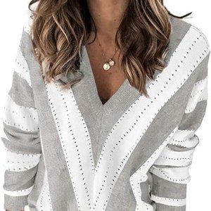 Women's V-Neck Grey & White Color block Striped Sweater~ Sz Large. NWT.