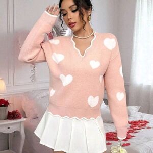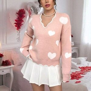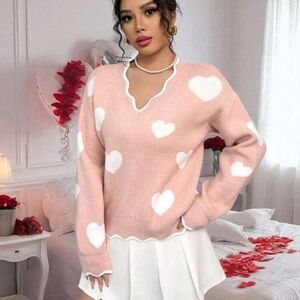 Women's V-Neck Heart Pattern Knitted Sweater With Ruffle Hem, Elegant & Romantic