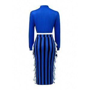 Women's V-Neck Long Sleeve T-Shirt & Contrasting Striped Ruffle Hem Skirt Set