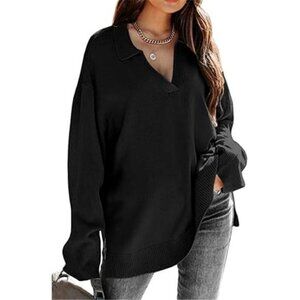 Women's V-Neck Oversized Sweater – Long Sleeve Collared Tunic Knit Pullover