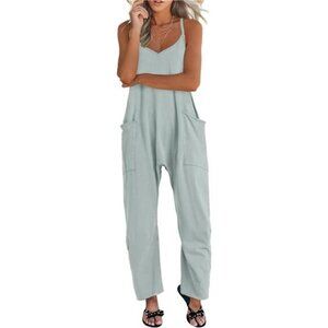 *FEATURES: Adjustable one piece jumpsuits for women.Deep v neck; Comfy & Baggy overalls; Wide leg long harem pant rompers for women; Loose fit design; Two big side pockets; Low crotch; Solid color; Lounge sleeveless jumpsuit with adjustable spaghetti strap