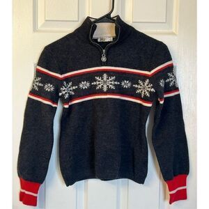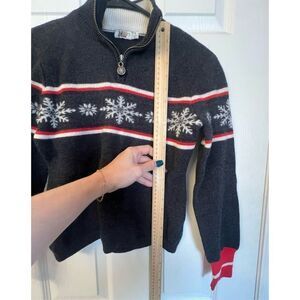 Stay cozy and stylish with this women's V-neck sweater featuring a charming snowflake design. The dark gray color is complemented by red and white accents, making it perfect for winter wear.
