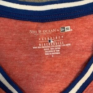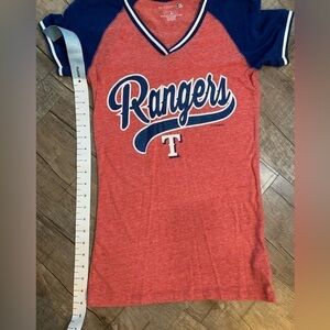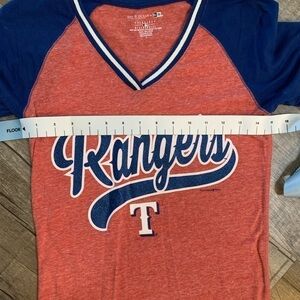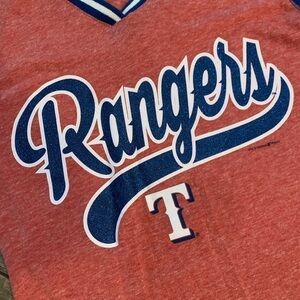 5th and Ocean V-neck women's Texas Ranger baseball tee. Made of 50% polyester, 37% cotton and 13% raylon. Rangers logo is accented with an adorable blue glitter vinyl.