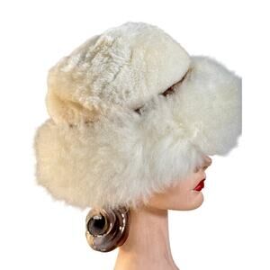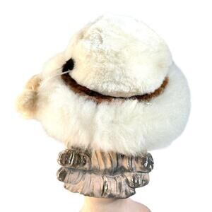 This delightful vintage ivory shearling hat from the 1970s features a charming big brim and fun double pom pom details! It's incredibly soft, just like a kitten, and is lined for extra comfort. It will comfortably fit head sizes up to 23-24 inches—perfect for a cozy outing!