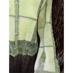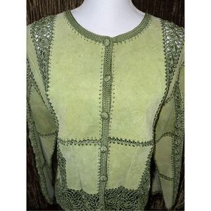 Women’s VTG Leather & Crochet Patchwork Cardigan Sweater. Button down crochet buttons; no tag found. I think it’s SMH BRAND. Leather/nylon.