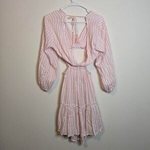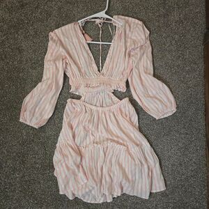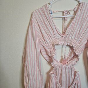 Perfect Beachy pink and sparkle stripe dress!! Deep v neck and tummy cut out. puff sleeves. Lightweight material! Perfect for a swim coverup or lake fit!