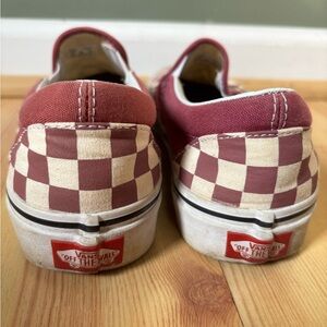 Classic checkerboard design. Easy slip-on style. These served me well and I loved them, I just don’t wear them enough anymore. I wore these quite a lot, but they’re in great condition and still so comfortable. A unique spin on the classic slip-on Vans. They are a maroon/purple and cream checkerboard design.