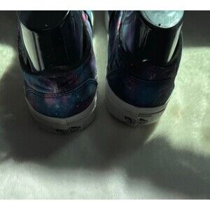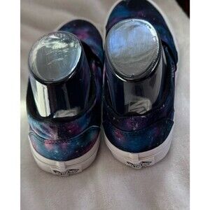 The product is a pair of women's Vans Galaxy slip-ons in size 9. These multicolor sneakers feature a low top design with a slip-on closure, standard shoe width, and comfort features. Made with fabric material, these athletic shoes are part of the Vans Classic Slip-On product line and have a cosmic galaxy theme. Ideal for school activities, these Vans Galaxy slip-ons are branded and designed for women who appreciate style and functionality in their footwear.