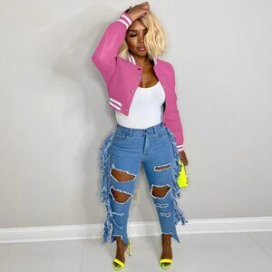 Women's Varsity Jacket Long Sleeve Button Down Bomber Jacket Streetwear Rose Red