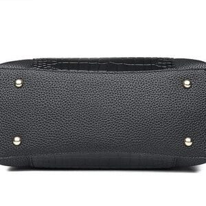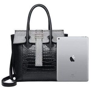 - This womens handbag is made of vegan black leather with a unique textured print, giving it a modern look.