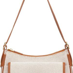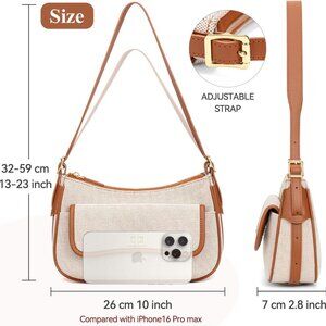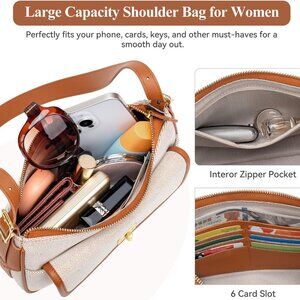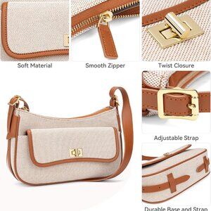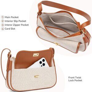 Features: This compact yet spacious crossbody bag measures about 10 inches wide, 2.8 inches deep, and 6.3 inches tall. It’s designed with a main compartment, a zipper pocket, interior pockets, and a front twist-lock pocket—perfect for organizing your phone, sunglasses, keys, lipstick, cash, and cards. Faux leather and canvas combo gives it a polished look with a lightweight feel.