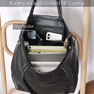 Features: Spacious and lightweight tote crafted from soft, durable vegan leather. It features a main compartment big enough for a 14-inch laptop, plus an internal pocket for your smaller essentials. The unlined, faux suede interior adds a touch of luxe, while the detacahble, adjustable shoulder strap gives you multiple ways to carry. Perfect for work, weekends, travel, or errands. Stylish yet practical!