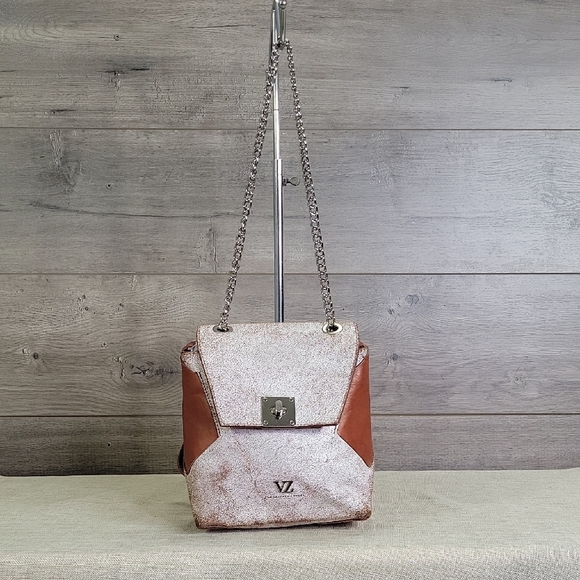 Silver tone hardware. Bag has chain shoulder strap and leather adjustable straps.