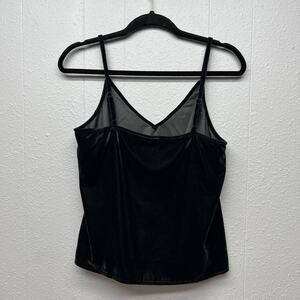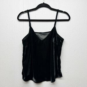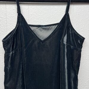 Women's pullover velvet top in dark gray or black...not sure... V-neck. Adjustable spaghetti straps. Side slits. Semi-cropped. Stretch. Lightweight. In good used condition. No stains, tears or holes.