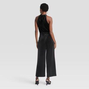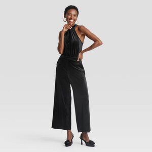 Get ready for the party with this Velvet Halter Jumpsuit from A New Day. Made of recycled polyester with spandex, this sleeveless jumpsuit is designed with a halter neckline for a chic look. Plus, this straight-leg jumpsuit sports a back half-length zipper for easy wear.