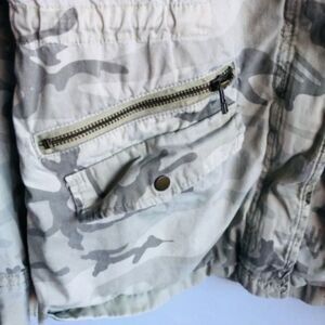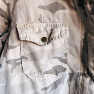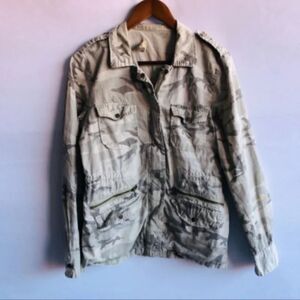 Lightweight Utility Tan and Army green Size Small There is a small discolored spot in the sleeve (see photos) it’s not very noticeable with the camouflage pattern