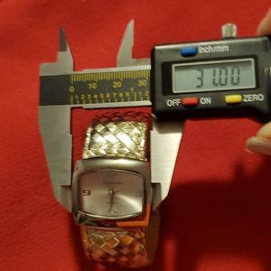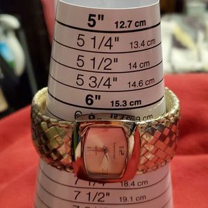 Silver case & bezel. Cuff covered in woven silver & rose gold leather