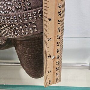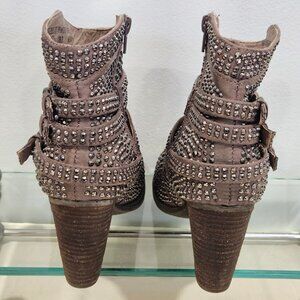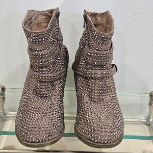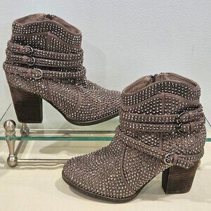 Women's Very G Rhinestone Studded Zip Up Buckles Bootie Size 8.5 Taupe Faux Suede.