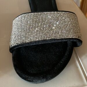 Women’s Victoria Secret Blingy (rhinestone) open toe size M black velvet flat sandals/slippers. Upper 93% polyester:7% Elastene Lining 100% polyester. These are preowned, but like new condition.