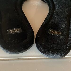 Women’s Victoria Secret Blingy (rhinestone) open toe size M black velvet flat sandals/slippers. Upper 93% polyester:7% Elastene Lining 100% polyester. These are preowned, but like new condition.