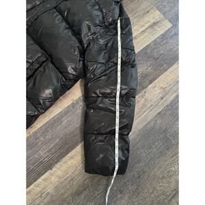 A stylish black puffer jacket by Vince Camuto, featuring a hood and quilted design. Perfect for cold winter weather, offering both warmth and sleek look. Size XXL.
