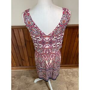 This dress is gorgeous! It is in excellent pre-loved condition. No rips or stains! It is mostly different shades of pink, but it does have a fun neon orangish/pink, too! It is sleeveless and has great stretch! The back has a deep V design! Perfect for Summer! Measurements in photos. Size 6!