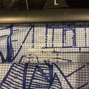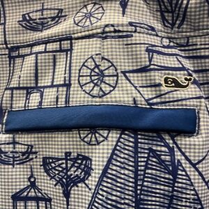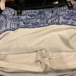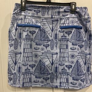 Women’s Vineyard Vines performance skort with a nautical navy and white pattern. 2 side pockets and 2 zippered back pockets. Soft white under shorts and side vents for comfort and ease of movement. Iconic whale logo on the back pocket. Excellent used condition.