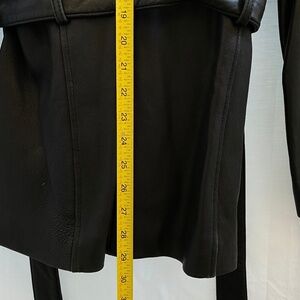 Women's Vintage 100% Genuine Lamb Leather Coat. Four buttons down for closure with belt. Fully Lined. Inside pocket.